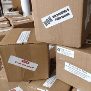 For each day of the 60 day consultation process on Bill 70, Minister Blais will receive 60 packages containing 404 cards to remind him that it is impossible to live on a welfare benefit of $404 per month.